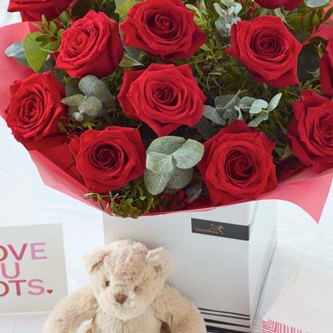 A classic dozen luxury red roses, plus an adorable teddy bear, scrummy chocolates and a card too – this one ticks every single box, they're going to love it...