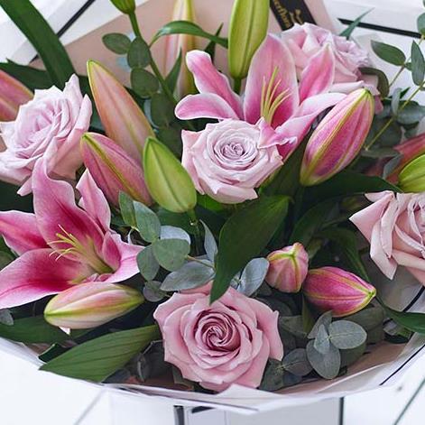 Think pink! A dreamy mix of pink roses and lilies. Incredibly charming.