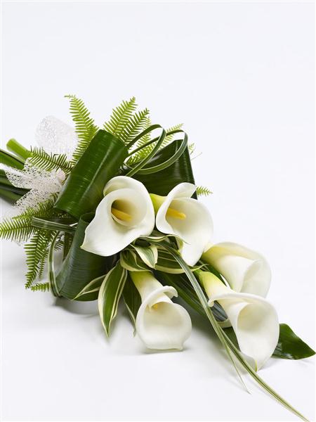Classic white calla Lilies tied with a natural ribbon are complemented with foliages and by looped aspidistra leaves to create this contemporary sheaf.
