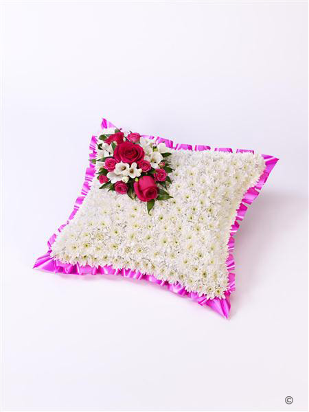 A classic cushion-shaped design created using a mass of white double spray chrysanthemums and finished with a spray of cerise roses and white freesias and a pink ribbon trim.