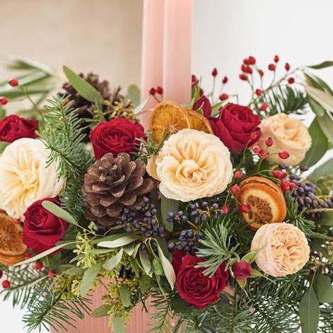 Send them flowers fit for the Christmas table. This beautiful arrangement centres around a festive candle. It'll feature blooms in rich red and green shades, with peach and cream highlights and pops of burgundy and cerise.
