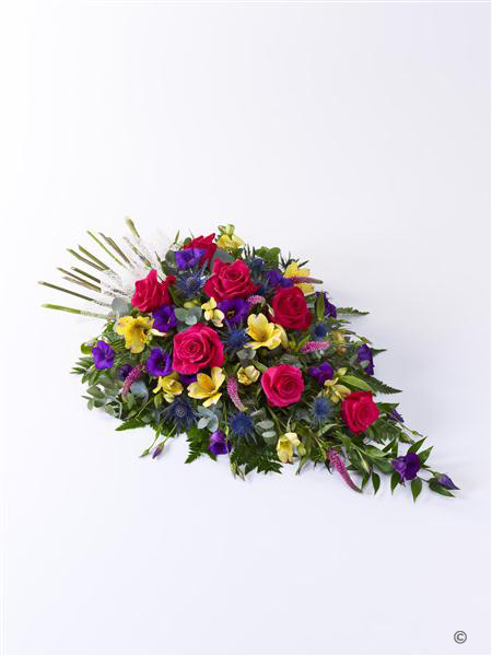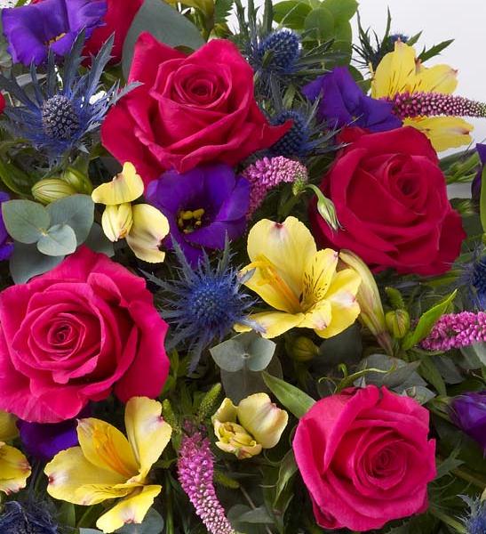 Large-headed roses, lisianthus, alstroemeria and veronica in pretty pinks, lilacs and creams are set off by blue eryngium, luxury foliages and a natural ribbon bow to create this woodland spray.