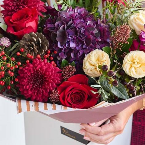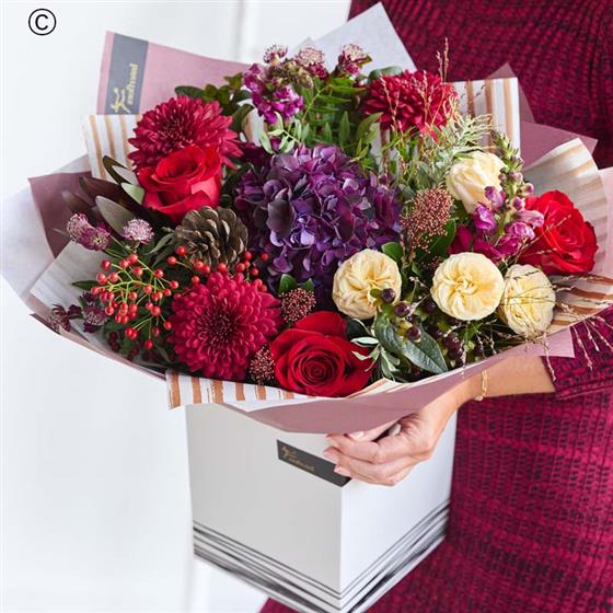 One of our larger Christmas bouquets this handcrafted marvel will feature a wonderful mix of luxurious flowers. It'll feature blooms in shades of red and green, with peach and cream highlights and pops of burgundy and cerise.