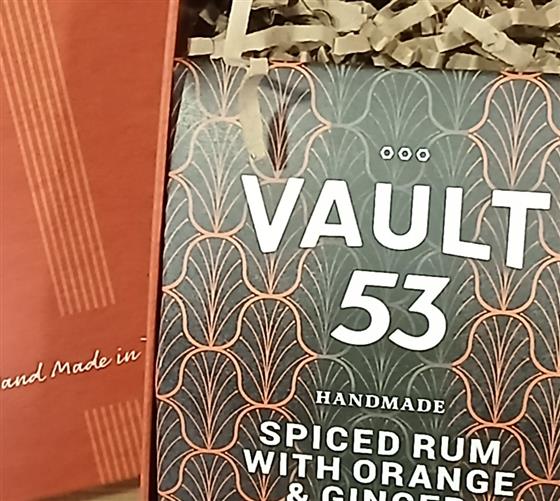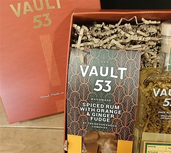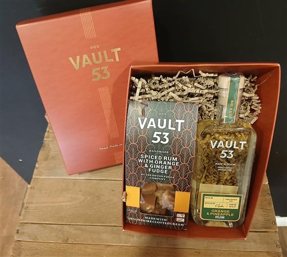 Clotted Cream Fudge handmade with Spiced Rum, Orange & Ginger 175g box with a 50cl bottle of Orange & Pineapple Rum by Vault 53 - 37.5%vol delivered in an attractive presentation box.