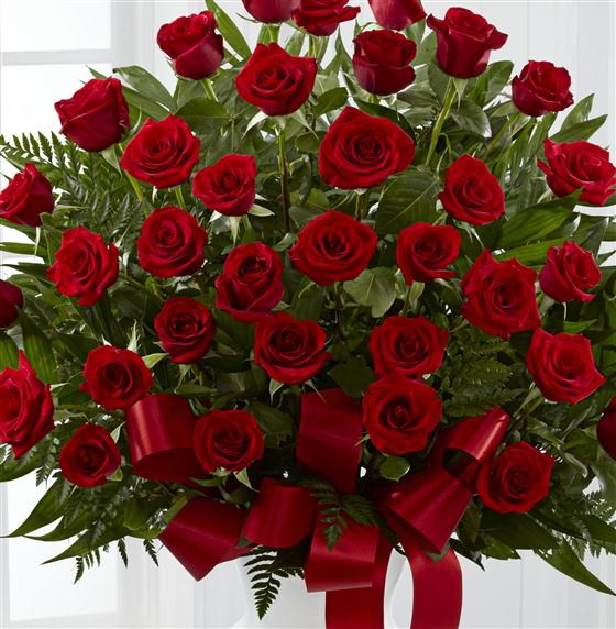 Brilliant red roses are elegantly displayed in a white plastic urn and accented with lush greens and red satin ribbon to create a beautiful tribute to be displayed at the service.