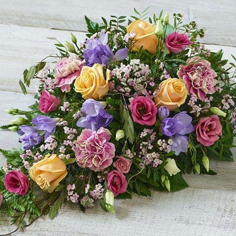 A profusion of fragrant pastel blooms arranged in a teardrop shape. Features scented freesia, peach roses, and natural willow and grass.