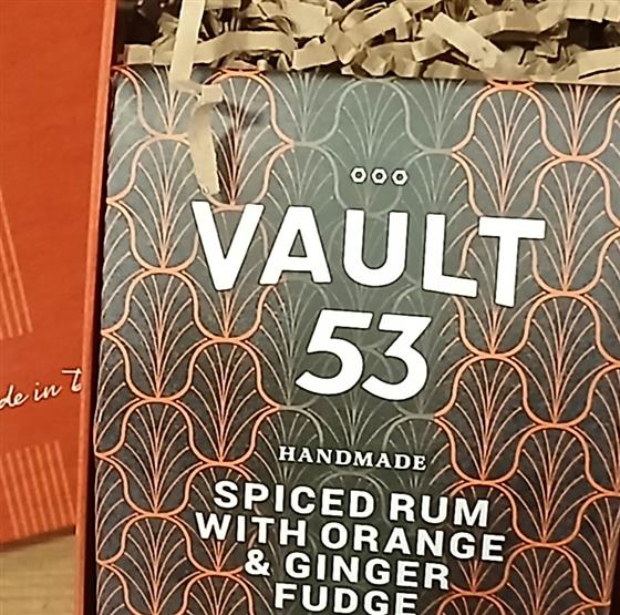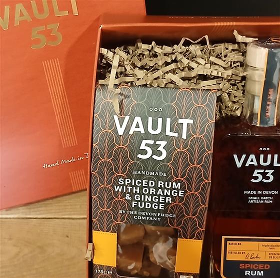 Clotted Cream Fudge handmade with Spiced Rum, Orange & Ginger 175g box with a 50cl bottle of Spiced Rum by Vault 53 - 37.5%vol delivered in an attractive presentation box.
