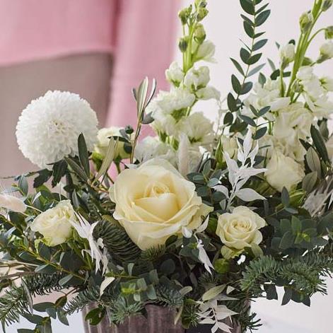 A dark copper colour bowl bursting with fresh and dried flowers in wintery colours, all chosen and arranged by a local florist.