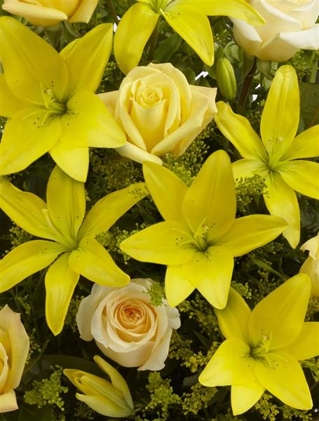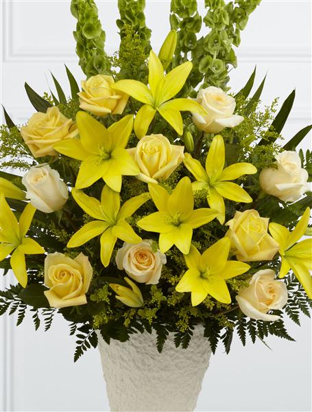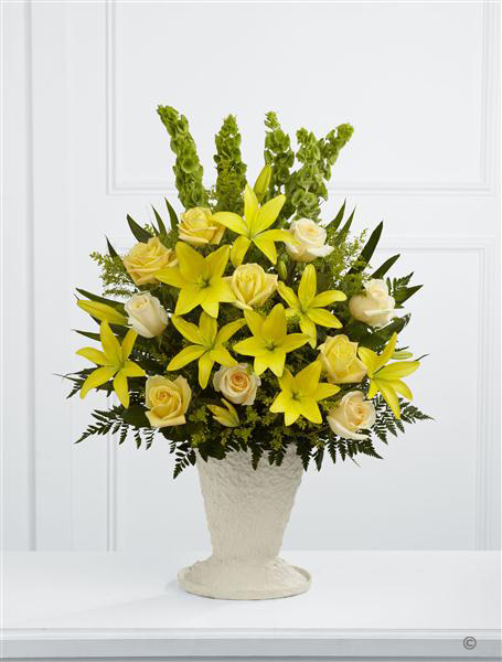 Yellow Asiatic Lily, roses and solidago are offset by cream roses, molucella, palm fronds and choice foliage to create a vibrant display. Arranged in a large papier mache urn, this beautiful display will make a lovely addition to the service.